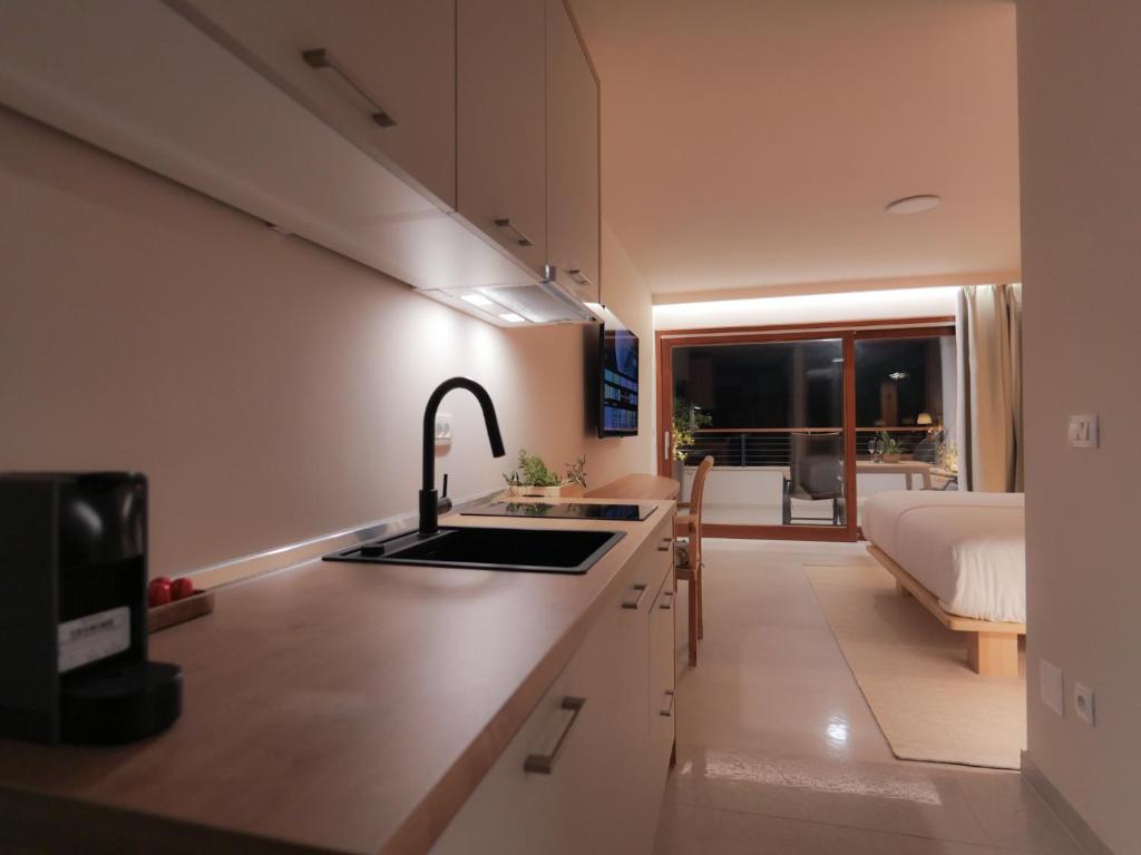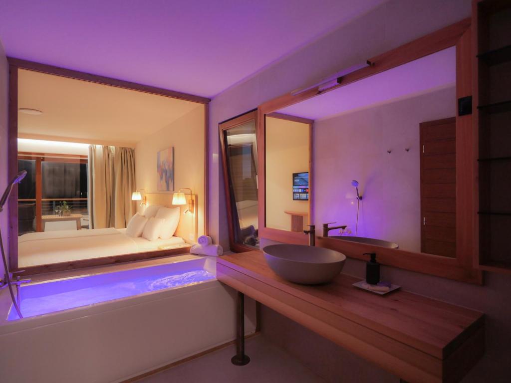 The interior is designed with romance in mind, elegant, modern furnishings, a fully equipped kitchen, a large contemporary bathroom, and premium 34 cm anti-allergy mattresses for a perfect night’s sleep. Daikin air conditioning, Smart TV, and high-speed 5G internet ensure total comfort, while complimentary laundry and ironing service let you focus on what truly matters, each other.